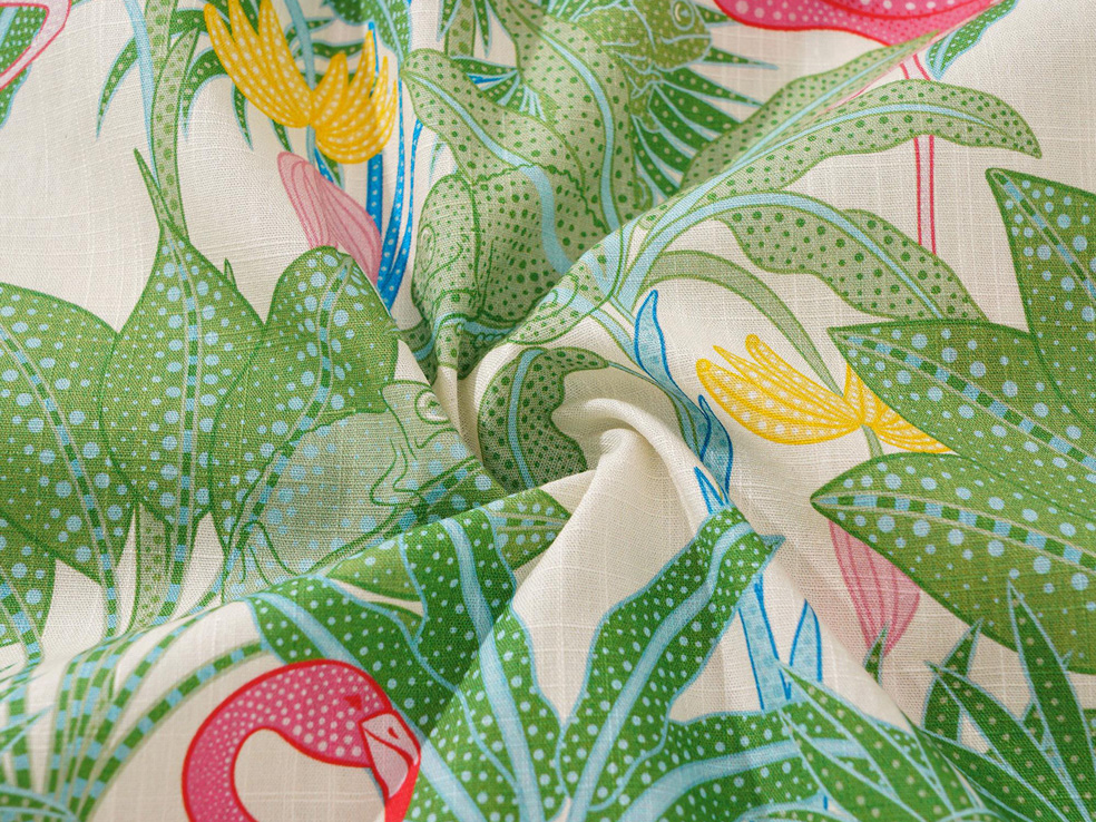 Mønsteret skildrer en jungelscene, der palmetrær og frodig vegetasjon slynger seg sammen. Blant plantene spankulerer elegante flamingoer stolt frem. Men de aner ikke at tre kamuflerte kameleoner er skjult blant bladene. Disse kameleonene følger nøye med på flamingoene, perfekt tilpasset de prikkete, stripete plantene som utgjør bakgrunnen deres. Utfordringen ligger i å oppdage disse skjulte skapningene. Klarer du å finne dem?